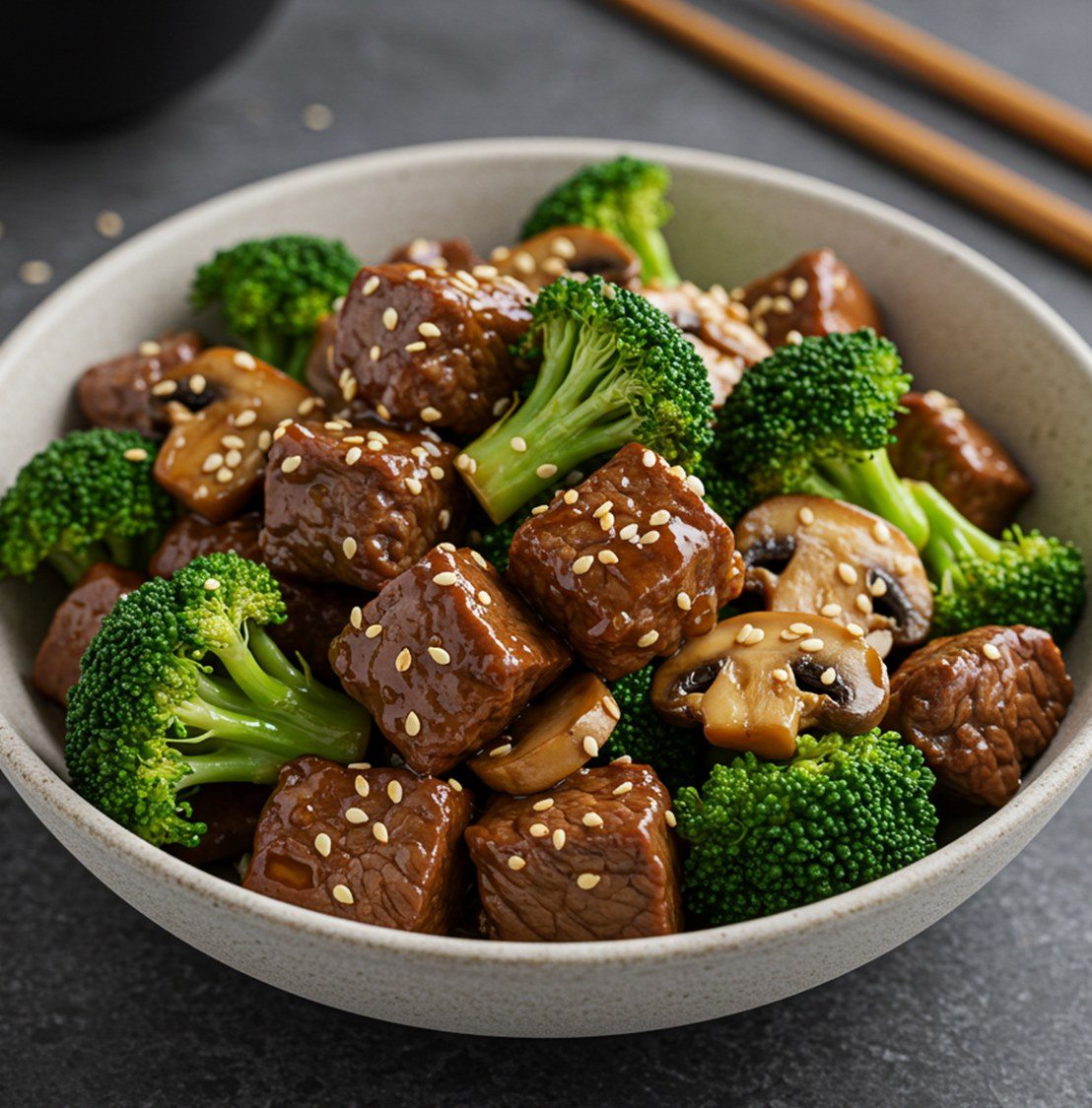 Añadir la carne junto con champiñones, agregar la salsa de ostión, la salsa de soya el vino blanco con el agua, continuar mezclando hasta que casi este a punto servir agregar los brócolis, mezclar y servir de inmediato.