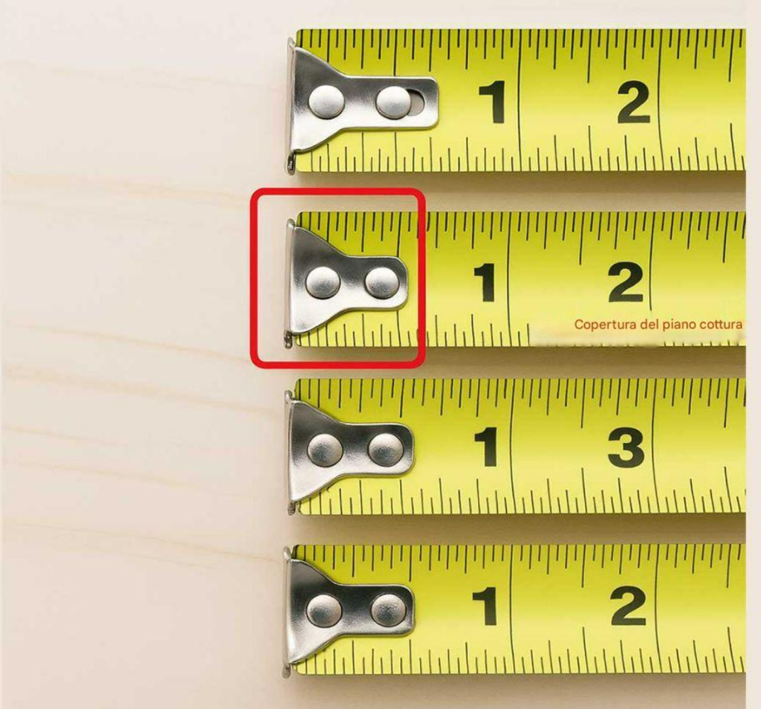 El extremo suelto de una cinta métrica está diseñado para que coincida con su grosor. Para medir dimensiones externas, como la longitud de una mesa, se empuja la punta contra el borde del objeto y el movimiento compensa su grosor. Por el contrario, para medir dimensiones internas, como el ancho del marco de una ventana, se tira de la punta contra el objeto y el movimiento compensa una vez más su grosor. Esto garantiza la precisión de la medición en ambos casos.